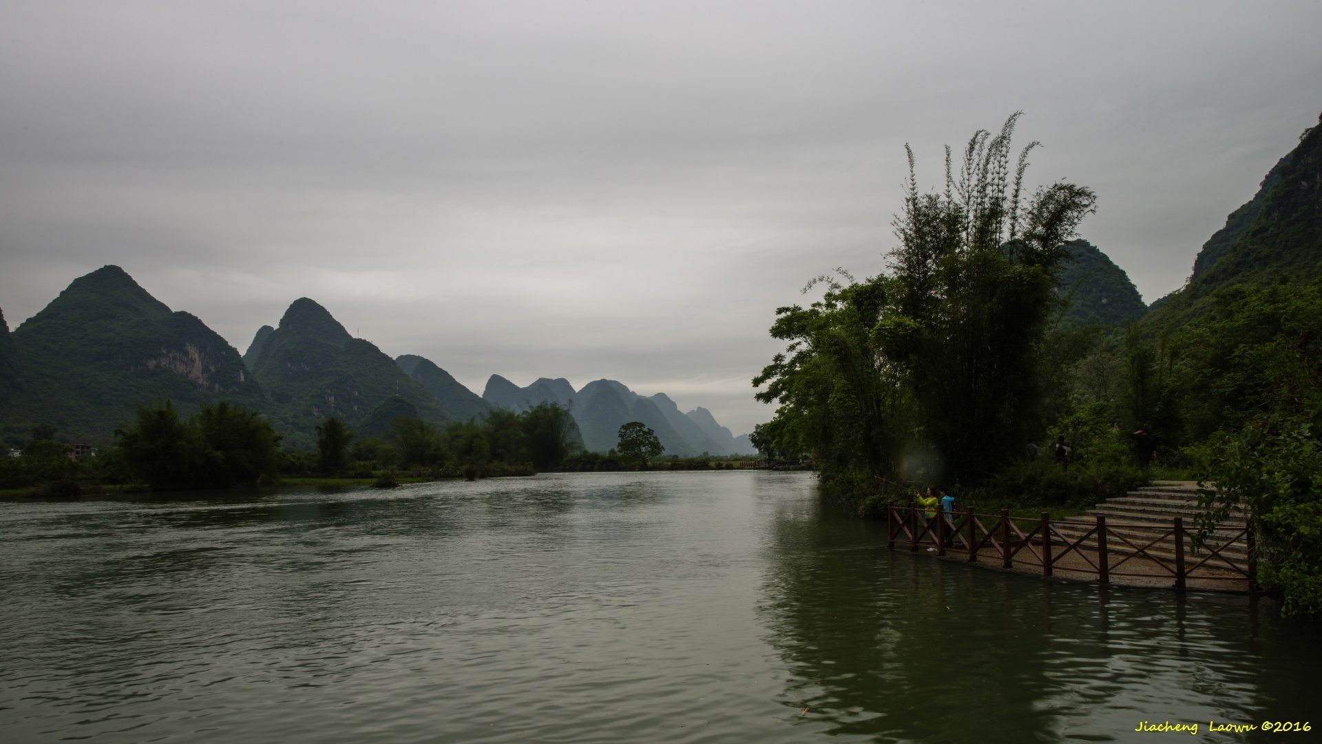 从月亮山回到桥上,过了桥头左拐就是沿遇龙河的道路。这条路不宽,往来的自行车很多,很多游客就是用租来的自行车沿这条路游览遇龙河。 不时也有汽车一路鸣迪,漂流下来的竹筏也是集中起来后由卡车沿这条路拉回到上游的码头。大约在11点半的时候, 我们在这条路上已经往上骑了很长的一段路程,突然间天色昏暗,狂风大作,大家纷纷往回赶,到了桥头,一个个的摊贩正在忙着收摊。 回到旅馆后,一切又平静了,躲避的暴风雨始终没有来。因为我们需要在下午3点半之前离开这里前往机场搭乘飞往张家界的航班, 不愿呆在旅馆浪费时间,看着天色渐渐恢复了平静,我们又骑车上了路,来到了冀马码头。到了码头,发现这里空空荡荡的, 河里连一个竹筏也看不见,河边只有一个当地的妇女在洗衣服。河水比起前一天清澈多了,但比起想象中的那种碧蓝还存在着距离。 原来有天气预报说当天有大暴雨,所有的漂流活动都停止了,不禁庆幸前一天的连续作战太及时了。虽然天空阴沉沉的, 但整个遇龙河及其沿岸却有着难得的安宁,岸上的道路上自行车和游人都很稀少。遇龙河的北沿有一条道路供游人行走, 也可以在上面骑自行车。 为了防止自行车横冲直闯,沿路有很多的台阶,这样骑自行车的人就不得不频繁地下来扛着自行车走。 我们沿着游人道一路往回返,不时停下来一边欣赏这里的山水,一边用相机将美景记录下来。过了大半路程后,天上开始飘起了零星的雨点, 我们也就加速了观光的步伐,到工农桥还车后回到旅馆门口,正好接我们去机场的出租车也到了。出租车刚离开旅馆, 大雨就倾盆而下,一路伴随着我们到了两江机场。坐在前往机场的车里,从车窗往外看65号高速沿途的风景,前方和左右两边的都非常不错。 在这样的暴雨天,一座座山头在一团团的乌云中若隐若现。这里虽然有山无水,前方车辆在路面山激起水雾恰似一条弥漫着雾气的河流。 写这篇游记的时候,我查对地图才发现,原来这条高速公路就沿着遇龙河的西南侧,难怪在高速公路上也能看见美景。