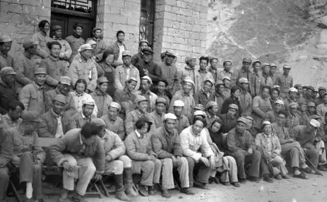 1942年5月,中共中央召开延安文艺座谈会,这是毛泽东、朱德等与参加延安文艺座谈会的代表们合影。