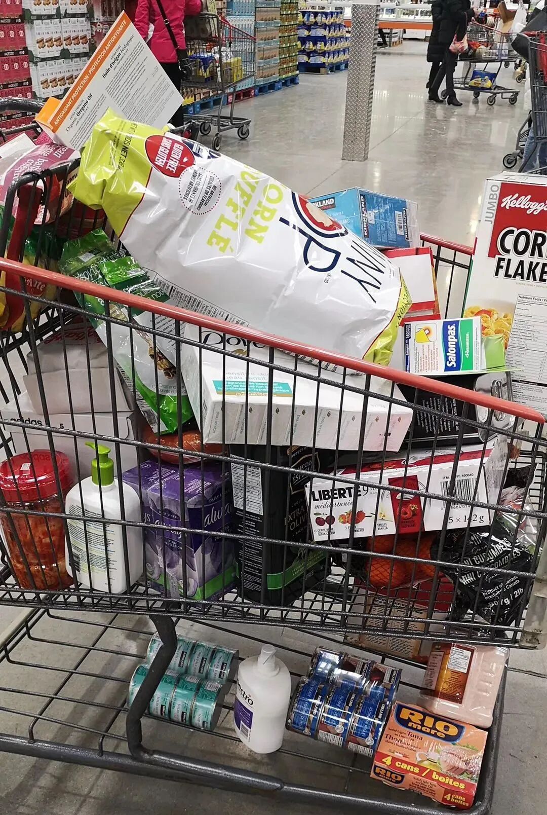 ?最逗的是一个中年老外,在各种食用油货架前看了半天跟我们说,“芥花油保质期最长,囤这个最好”。我说又不是打仗,不需要囤那么多吧!他马上告诉我们,已经开始失眠了。然后果断把手里5升一桶的换成了19升一桶。其实走出人满为患的Costco,世界还是和昨天,和上个月,和去年一样。比如我经常去的村里的西人超市Longo's,这个周六早晨比平时略微忙了一些,购物车里没有看到太多的焦虑。