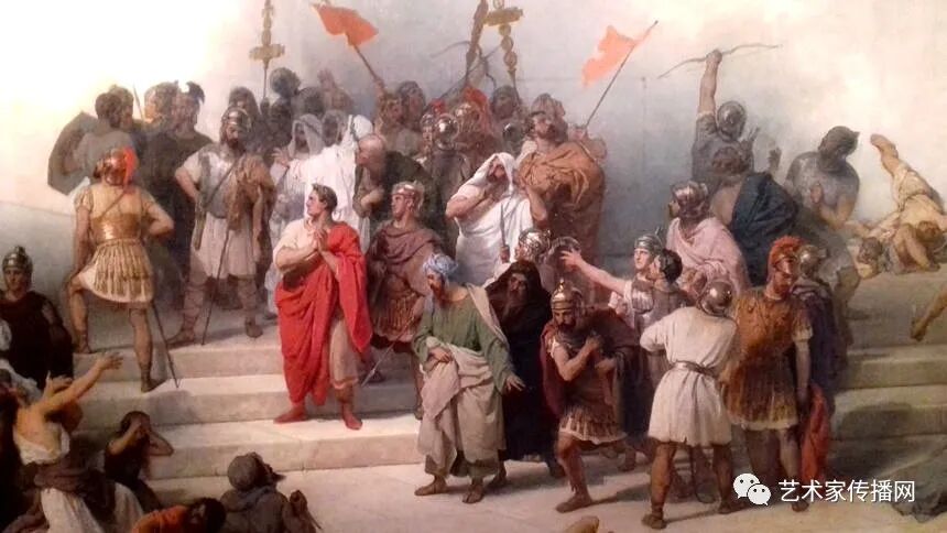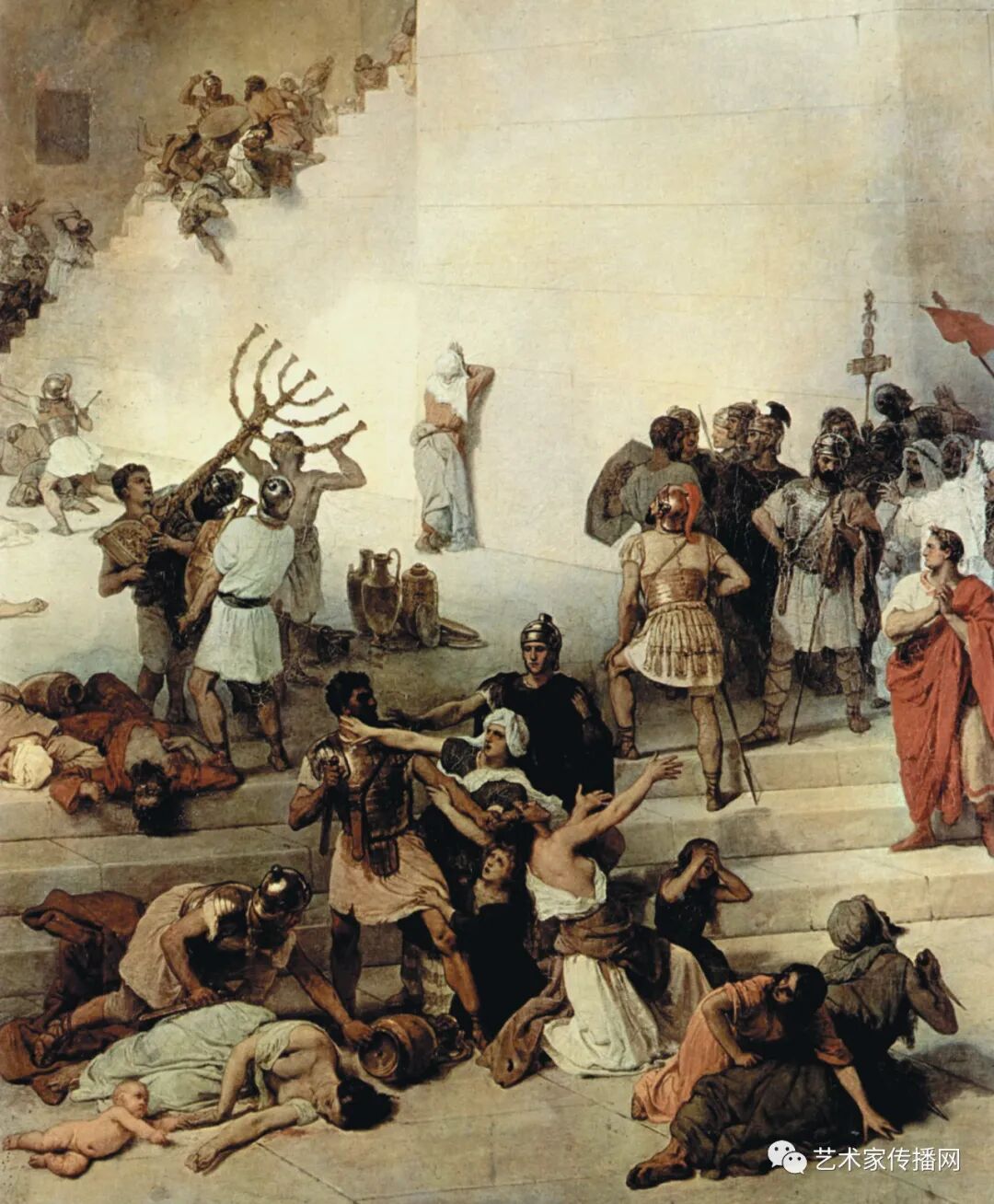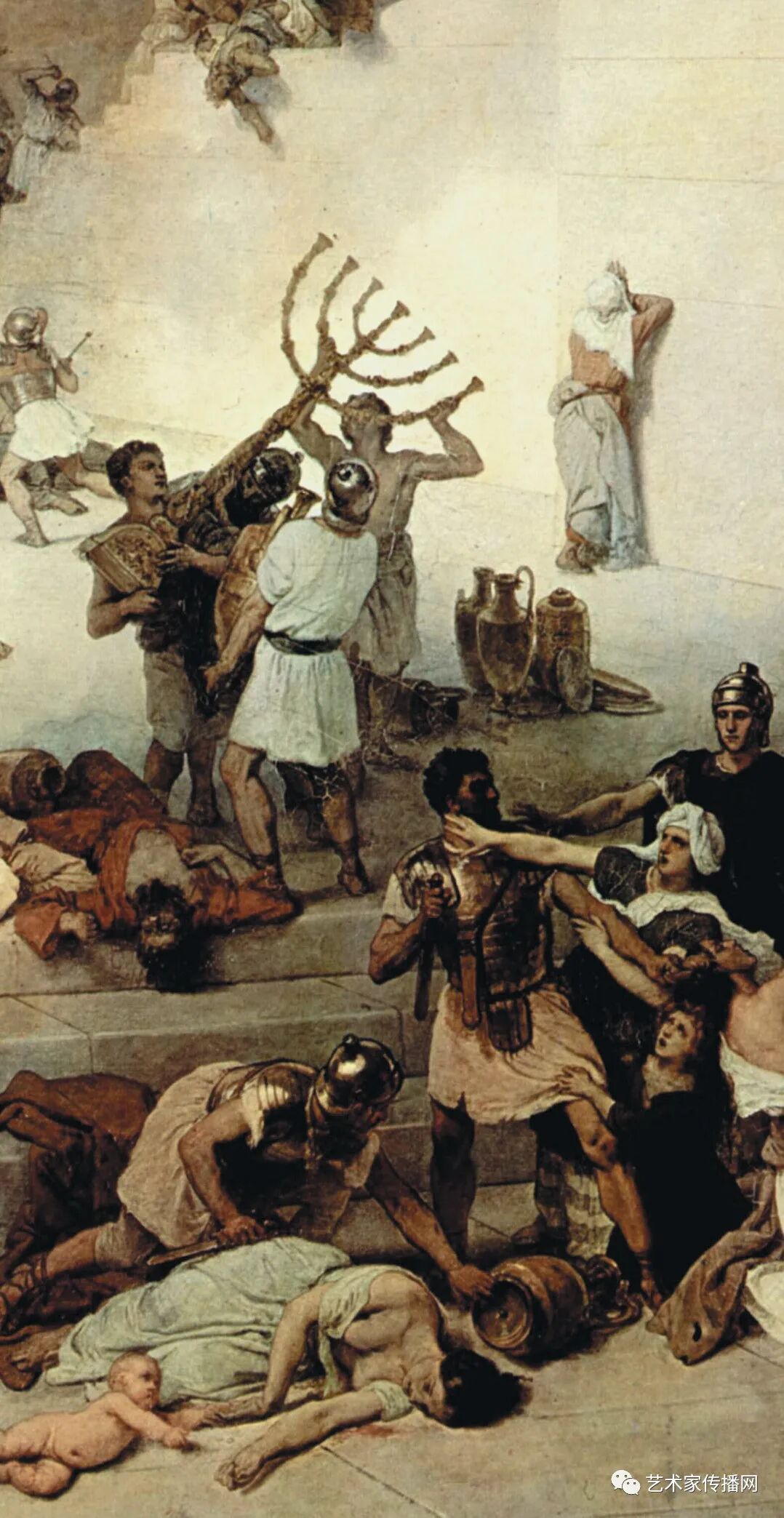 这一事件深刻改变了犹太人的命运,其历史影响存续至今。弗朗西斯科·海耶兹的这幅作品生动传神地体现了耶路撒冷陷落圣殿被洗劫的场景(注意左下角的烛台),被大量历史著作所引用。