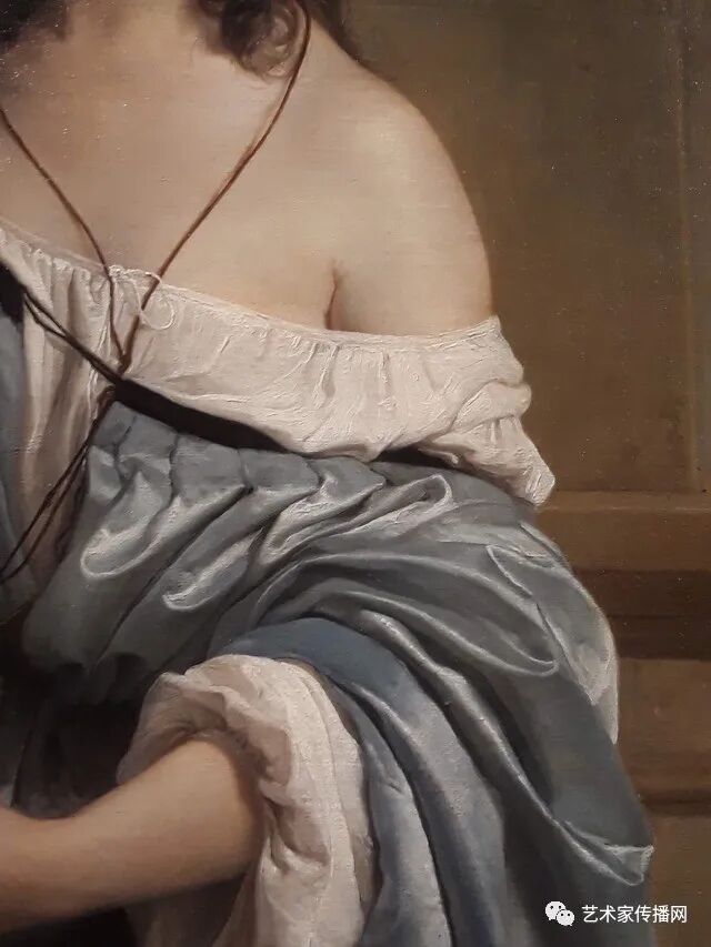 裙摆的褶皱在光线的照射下质感极强,女子的婀娜多姿被表现得淋漓尽致。男子暗红色的外袍和红色的裤子色彩对比和谐。暗黄的光线通过情侣投射在墙上,为画面铺上一层深情温馨的气息。