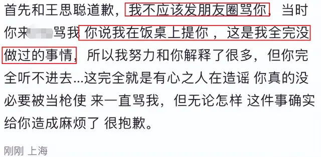 随后,这位女网红也第一时间站出来发声了。第一句,没有急着解释,居然还主动先和王思聪道歉了,称自己不应该发朋友圈骂他。可见对王思聪还是有些“尊重”,不敢轻易得罪。不过,女网红否认在饭桌上提及王思聪一事,表示是有心之人在造谣,还劝王思聪不要被人当枪使。
