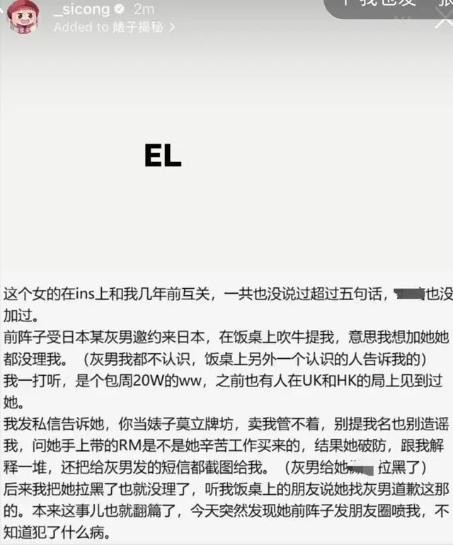 原来,这位女网红和王思聪早在多年前就已经互关了。不过,前前后后加起来的话总共没超过五句话,按理说就这样一切安好。可没想到,前阵子该网红被某灰男邀约来日本,在饭桌上吹牛提到了王思聪,称王思聪有意要追她,但自己都没理。