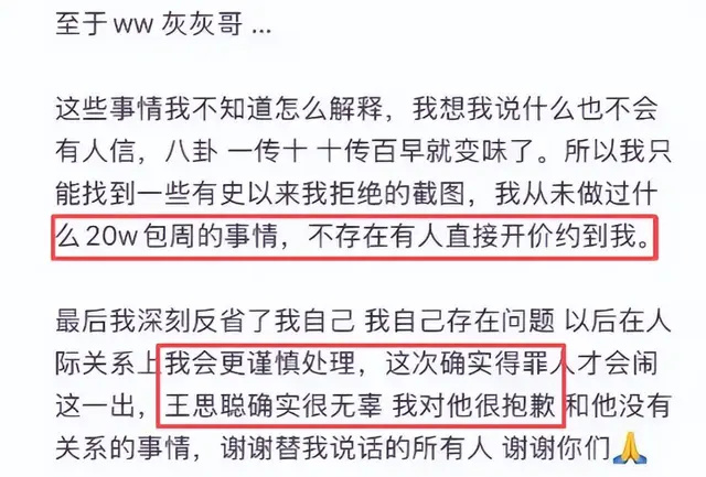另外,对于所谓的20w包周的事情,也做出了澄清,不存在有人直接开价约到自己。有意思的是,结尾这位女网红倒还“可怜”起王思聪来了,称其很“无辜”。