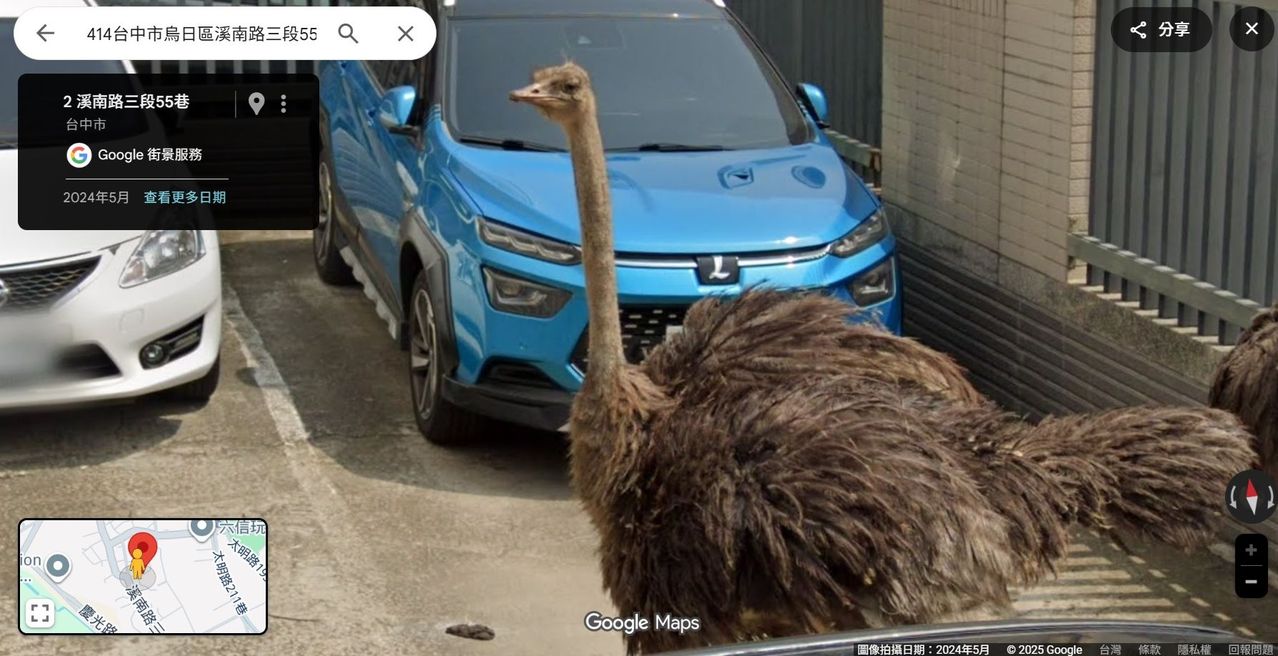 最近有网友意外发现去年台中乌日有围捕鸵鸟场面,鸵鸟还一脸不爽,影片一出,引起网友热议。 (图/截自Google Maps)