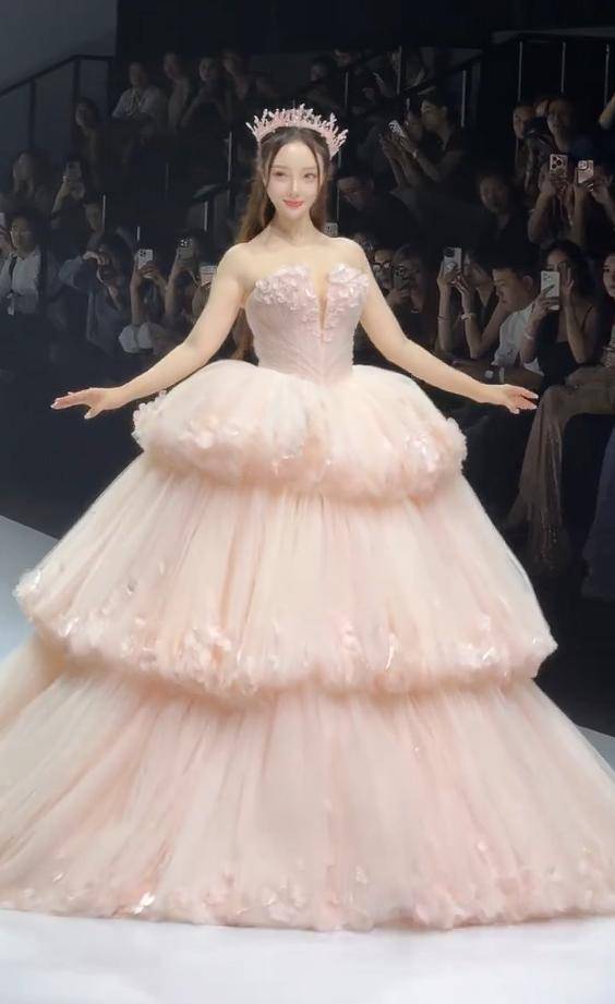 之后她又穿着一套粉色蛋糕裙礼服,单独走秀,边走边表演“芭蕾舞”,简单的直发,加上一个粉色王冠,让她很有公主感。