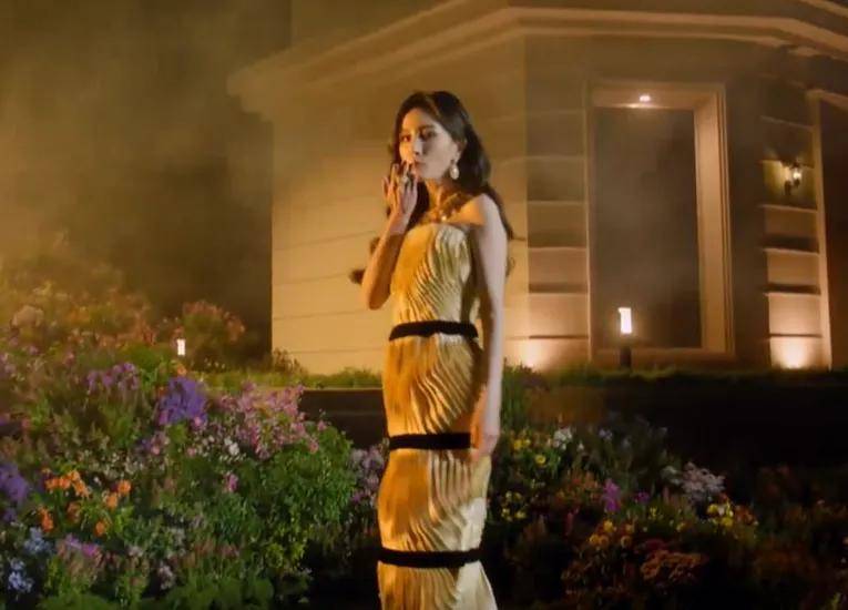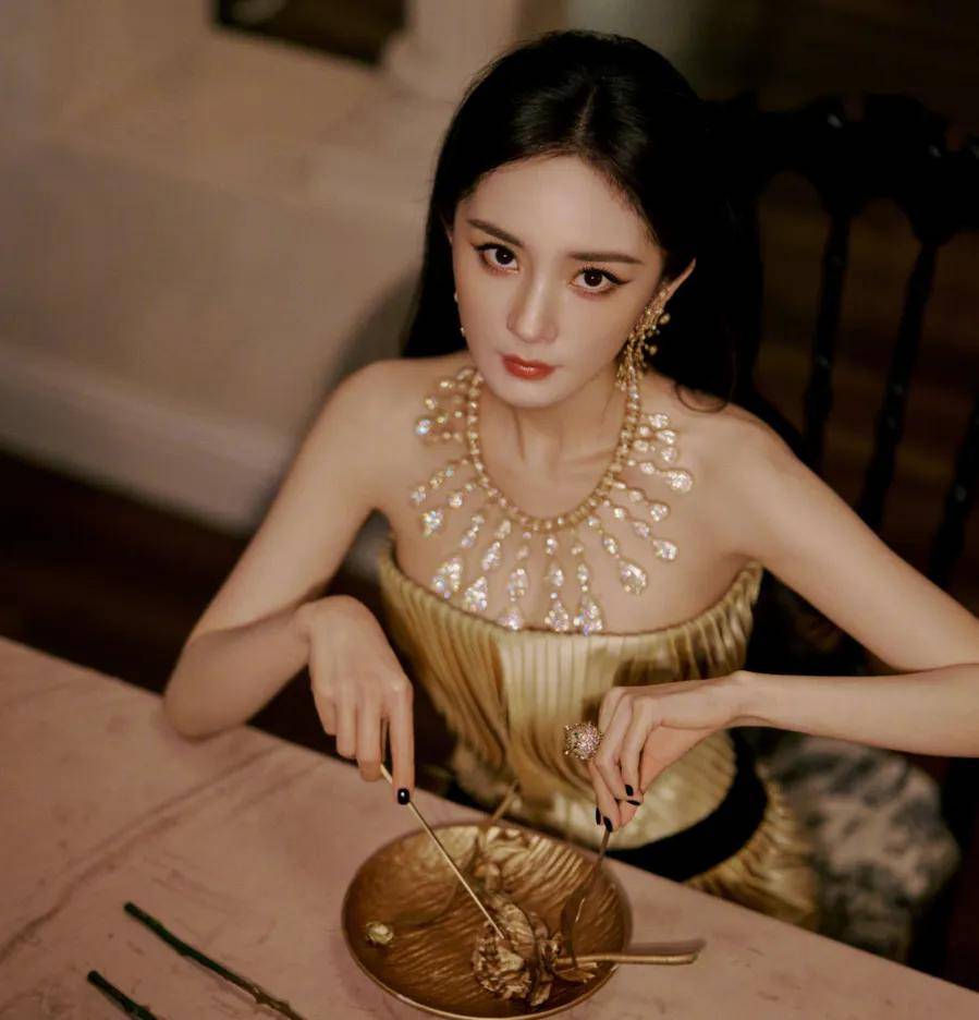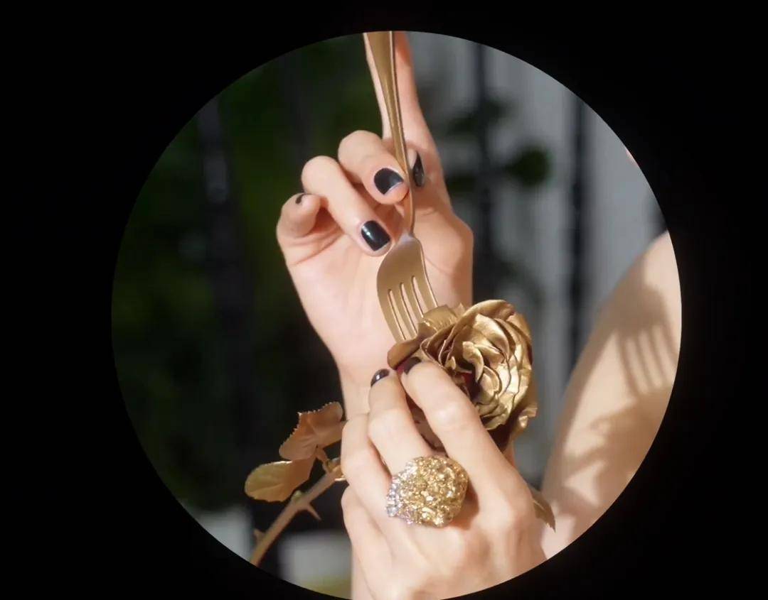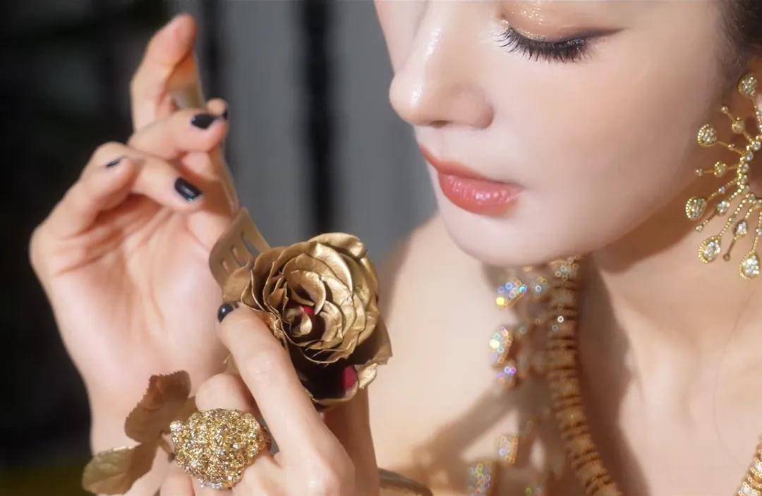 注意看,杨幂手拿刀叉,对着一朵玫瑰又是戳又是切,偏偏她切的玫瑰不是红色不是蓝色,而是金色。