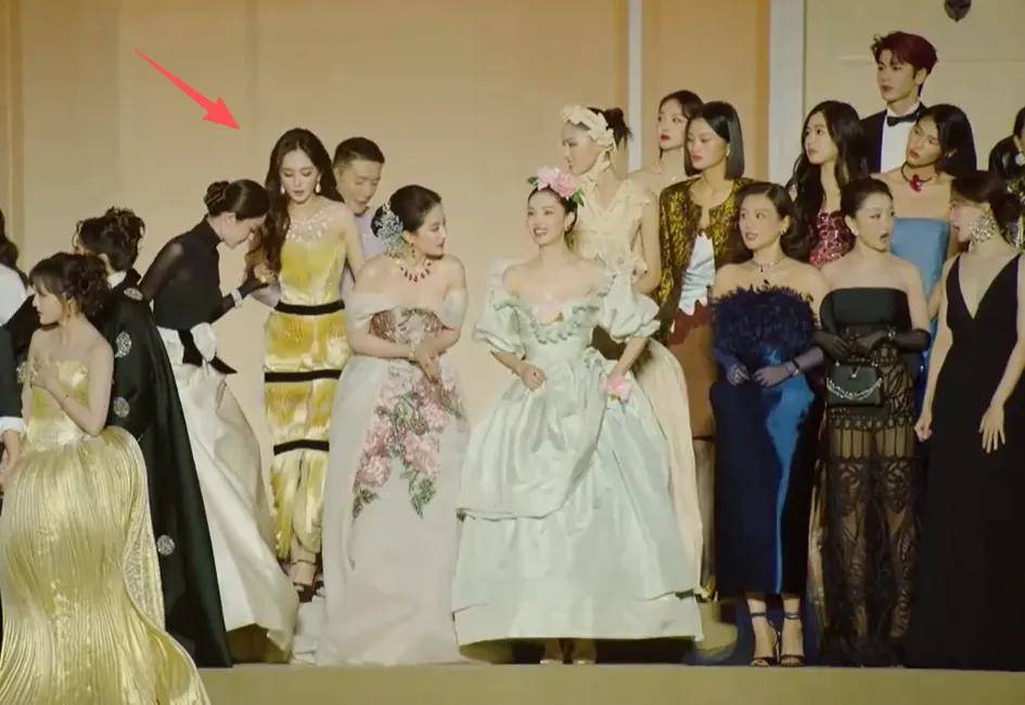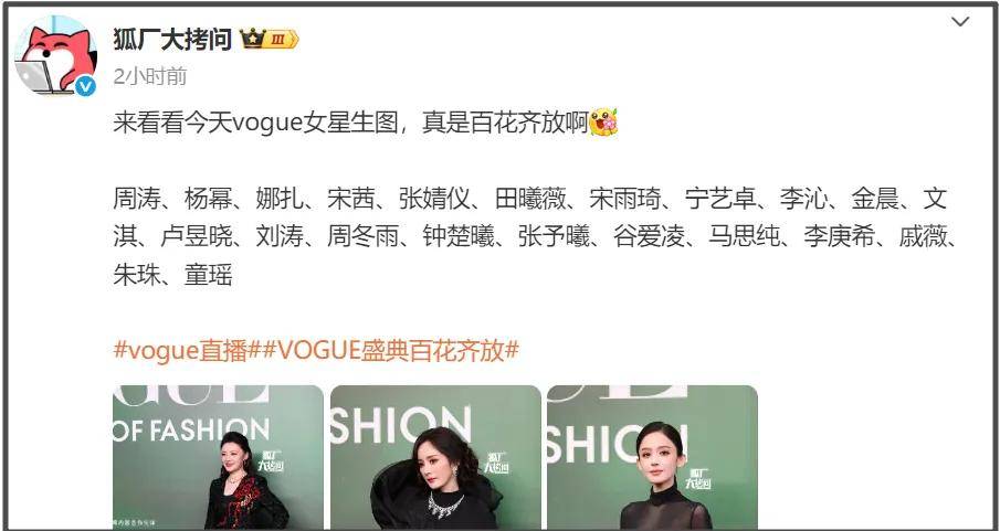 ——VOGUE主编刘冲牵着刘亦菲先出场占住C位,杨幂迟来一步,还是娜扎扶着她往中间站。