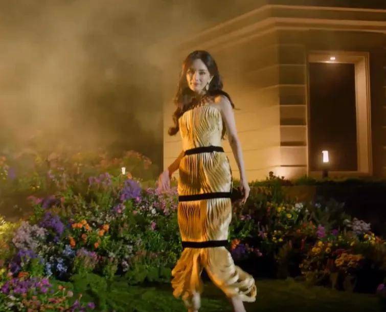 杨幂走秀第一个开场,时长和镜头拉满,却没有美感,地面铺设草皮不好走,暴露了杨幂体态短板,几个定点特写越看越好笑。