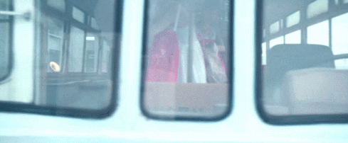 在假扮平壤机场的过程中,路人甲穿过吵闹的人群,走过由大巴构成的分界线。