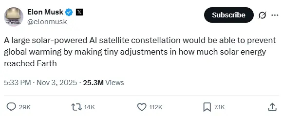 本周,马斯克在X平台上分享了一个新的疯狂设想:发射一个人工智能卫星到太阳和地球中间,通过精细调整来控制太阳辐射到地球的能量,以阻止全球变暖。