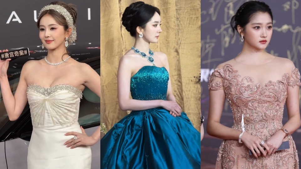 再加上胡杏儿这身复古的绿,你们仨可以直接上台来一首扇子舞了,太扎眼。