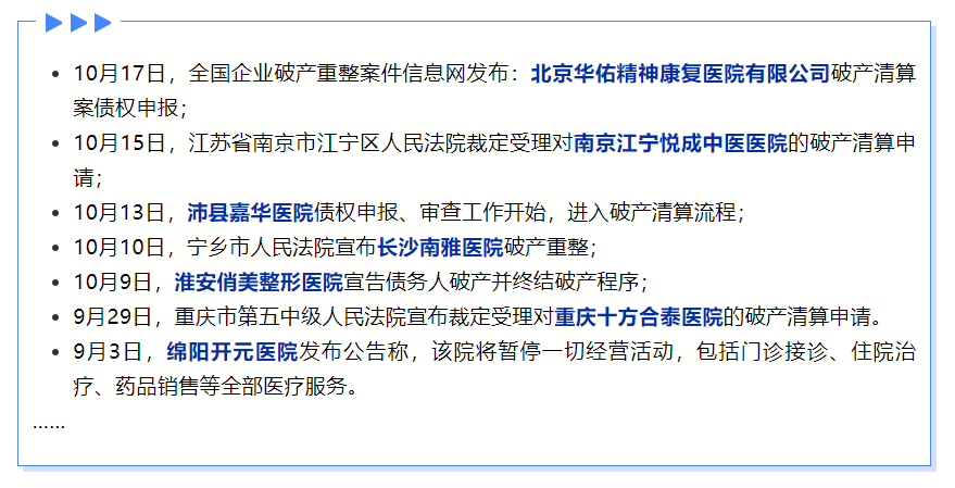 下半年依旧没有停止关停的步伐,绵阳开元医院、长沙南雅医院、南京江宁悦成中医医院等等,接连破产重组。最新的11月8日,黑龙江五常市中医医院发布了破产清算案第一次债权人会议公告。
