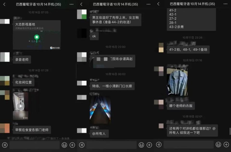 10月14日至18日凌晨,高俊生前参与的最后一个项目在郑州完成拍摄。他担任执行导演,负责现场统筹与各部门调度。剧组工作群里,每天早晨7点多发布拍摄筹备通知,次日0点后,仍有夜宵、遗失物品、次日车辆安排等消息在更新。王飞推测,剧组单日工作时长超过17小时。