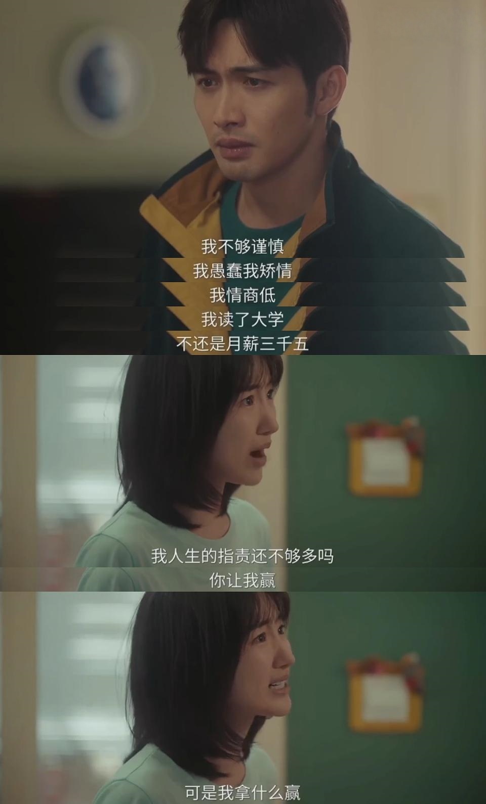 面对秦南的追问,叶思北曾经绝望地说出“我就是个烂人”,她在痛苦中认命般地接受了烂泥一样的人生:“小时候我以为我努力读书就可以改变人生,可是没有;我以为我努力工作就可以改变人生,可是没有;我以为最难熬的永远是现在,只要熬过去了,最美好的永远在未来,可是结果呢?永远有更多的苦难在未来等着你……我读了大学,不还是月薪三千五。你让我赢,可是我拿什么赢?”