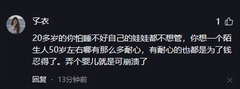 20多岁的你怕睡不好自己的娃娃都不想管,你想一个陌生人50岁左右哪有那么多耐心,有耐心的也都是为了钱忍得了。弄个婴儿就是可崩溃了