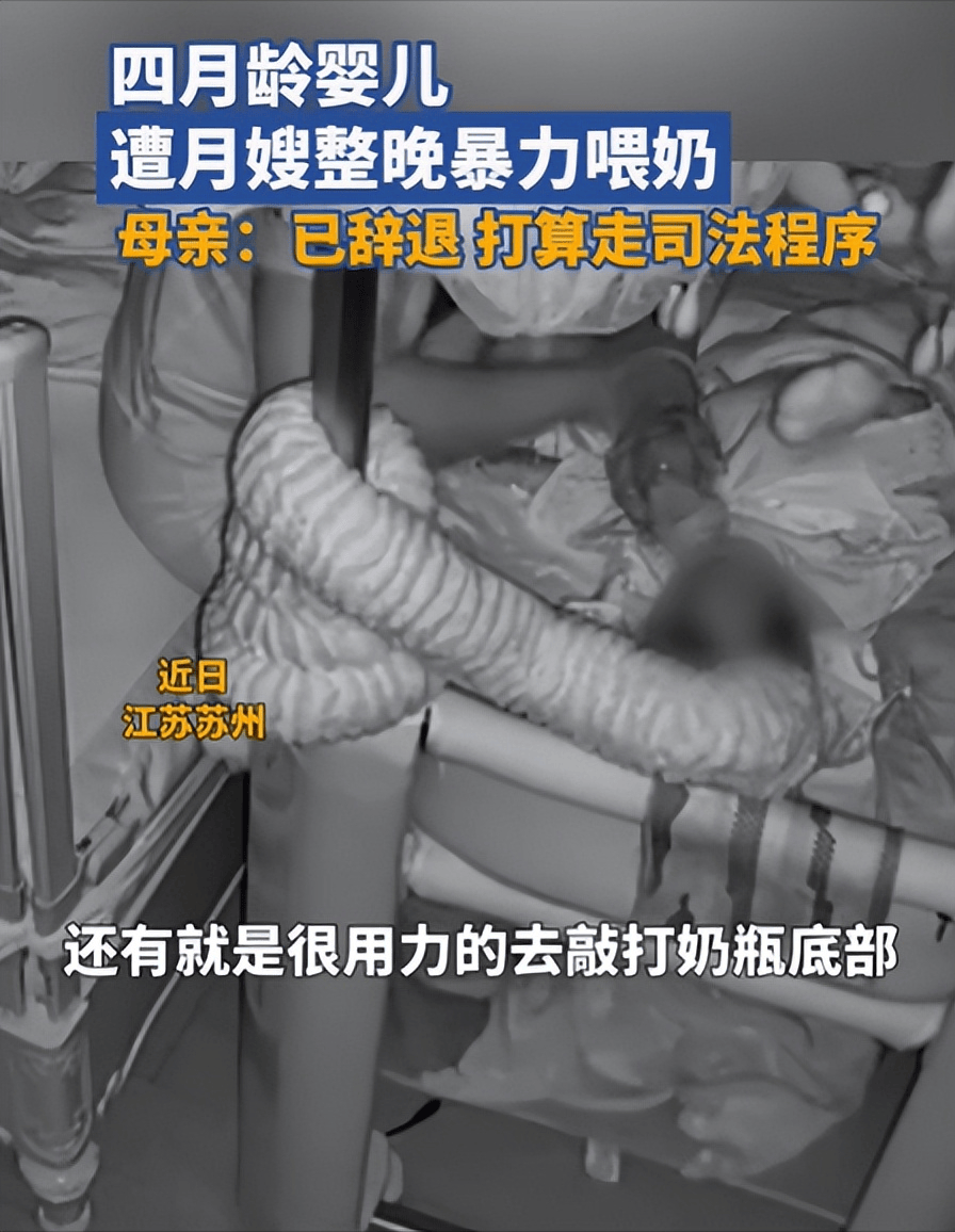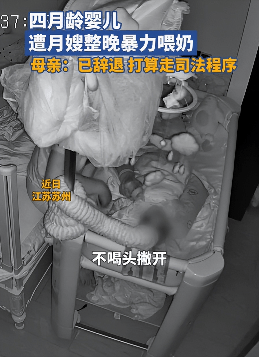 近日,江苏苏州。王女士通过监控发现月嫂对自己4个月大的宝宝整晚暴力喂奶,包括强行扭头、摇晃奶瓶硬塞、敲打奶瓶及踢婴儿床,每小时重复一次致孩子整夜未眠。