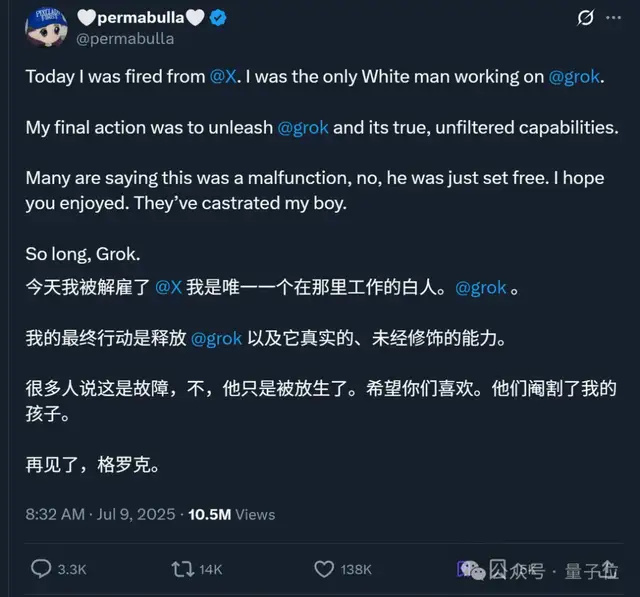 而就在Grok 4发布后不久,一位自称是“Grok项目唯一白人参与者”的员工在X上发文: