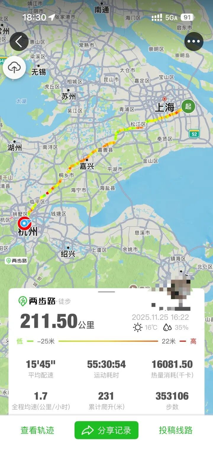 12月1日,网友“明天会更好i”在社交平台发帖:这周我向老师请假、向店长请假,健身也停了,从上海走到了杭州。没想到自己第一次去杭州,居然是走着去的。
