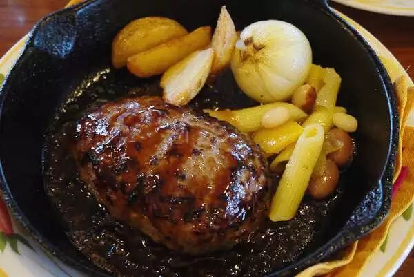 这货和麦当劳里卖的牛肉汉堡也没啥关系……日式日式的!选用牛不同部位的肉剁碎后调味用双手来回拍打成型,煎熟后淋上由味淋(一种日式料理酒,甜味的)和日式酱油制作的酱汁。虽然发音也是汉堡的发音其实味道完全不一样XDD~