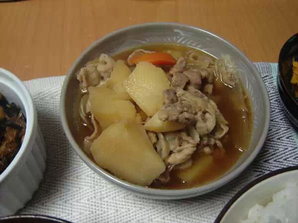 用牛肉或是猪肉加马铃薯、洋葱、魔芋等食材再用酱油、砂糖、味醂煮甜的料理。说到这道菜其实和英国有关系。19世纪末期一位日本军官在朴茨茅斯留学,非常喜欢吃当地的炖牛肉,回到日本以后尝试让海军的厨师制作这项料理。但是没有葡萄酒也没有英国的酱汁,厨师没吃过当然也根本不知道炖牛肉是什么,就凭着军官的说法和自己的想像用酱油和糖做了这道菜,没想到还挺好的~又因为材料简单做法容易,很快这道菜就在民间普及开来,成为一道『国民菜』。