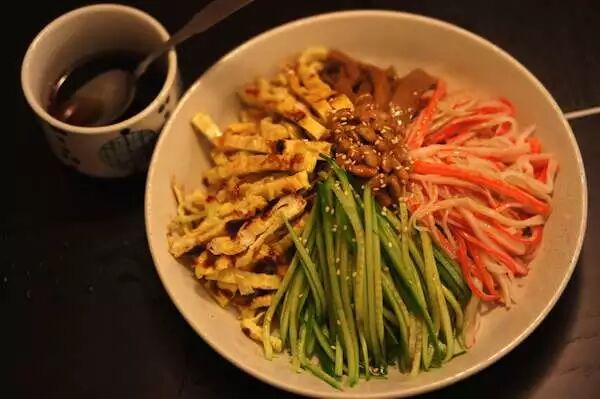 中华冷面=-=跟小时候楼下吃的五块钱一份的冷面没有半毛钱关系……配料主要有蛋皮,半熟蛋,黄瓜丝,鸡肉丝,日式红姜丝,味道比我们小时候楼下吃的五块钱一份的冷面偏酸甜。