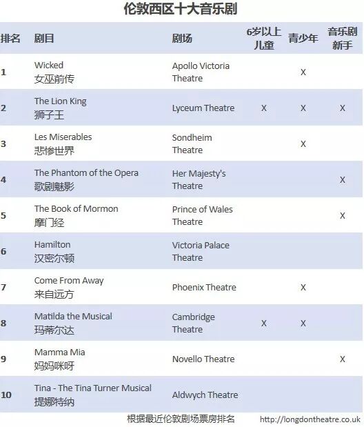 以下是“伦敦剧院”网站列举的西区最热音乐剧供音乐剧选剧新手参考。